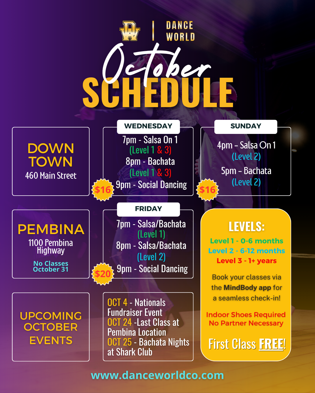 Bring indoor/dance shoes, no outside footwear allowed on the dance floor. No black sole sneakers allowed. (Ladies, only proper Latin dance heels allowed, please check for any protruding heel nails prior to class to avoid damaging the floors)